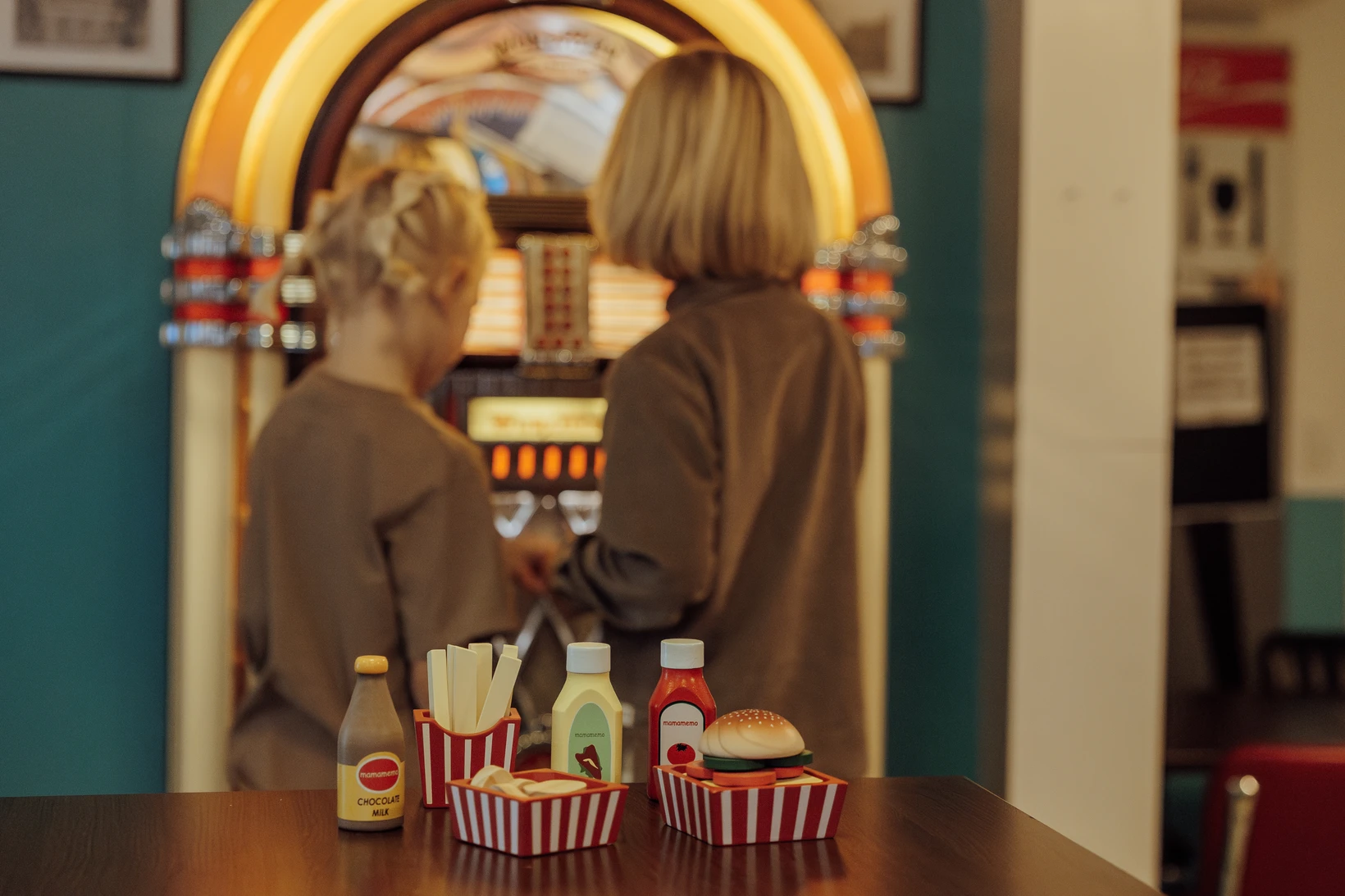 De set bevat een realistische houten hamburger, een sappig stukje kip en knapperige frietjes, allemaal netjes verpakt in drie rood-wit gestreepte bakjes voor extra plezier en authenticiteit. Kinderen kunnen hun eigen hamburgers maken, knapperige frietjes serveren en zelfs ingrediënten verwisselen voor een nieuwe creatie, elke keer dat ze spelen.