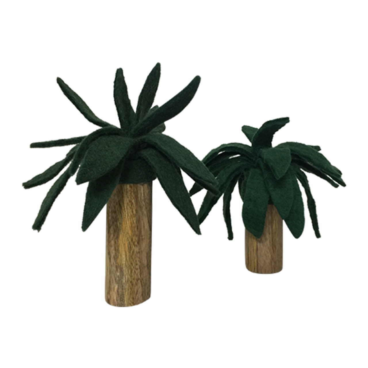 Nog een mooie combinatie van natuurlijk hout met natuurlijk vilt: de palmboomtoppen zijn gemaakt van vilt en bevestigd aan de bovenkant van de houten stam. Deze set combineert een kleine en middelgrote boom, prachtig voor allerlei kleine wereldopstellingen.