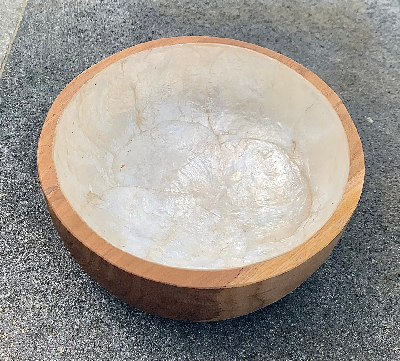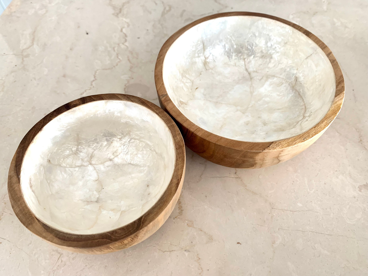 De teakhouten kommen zijn ingelegd met witte schelp, wat een glamoureuze parelmoerlook creëert. De ene kom heeft een diameter van 15 cm, de andere 12 cm, beide zijn 6 cm hoog.