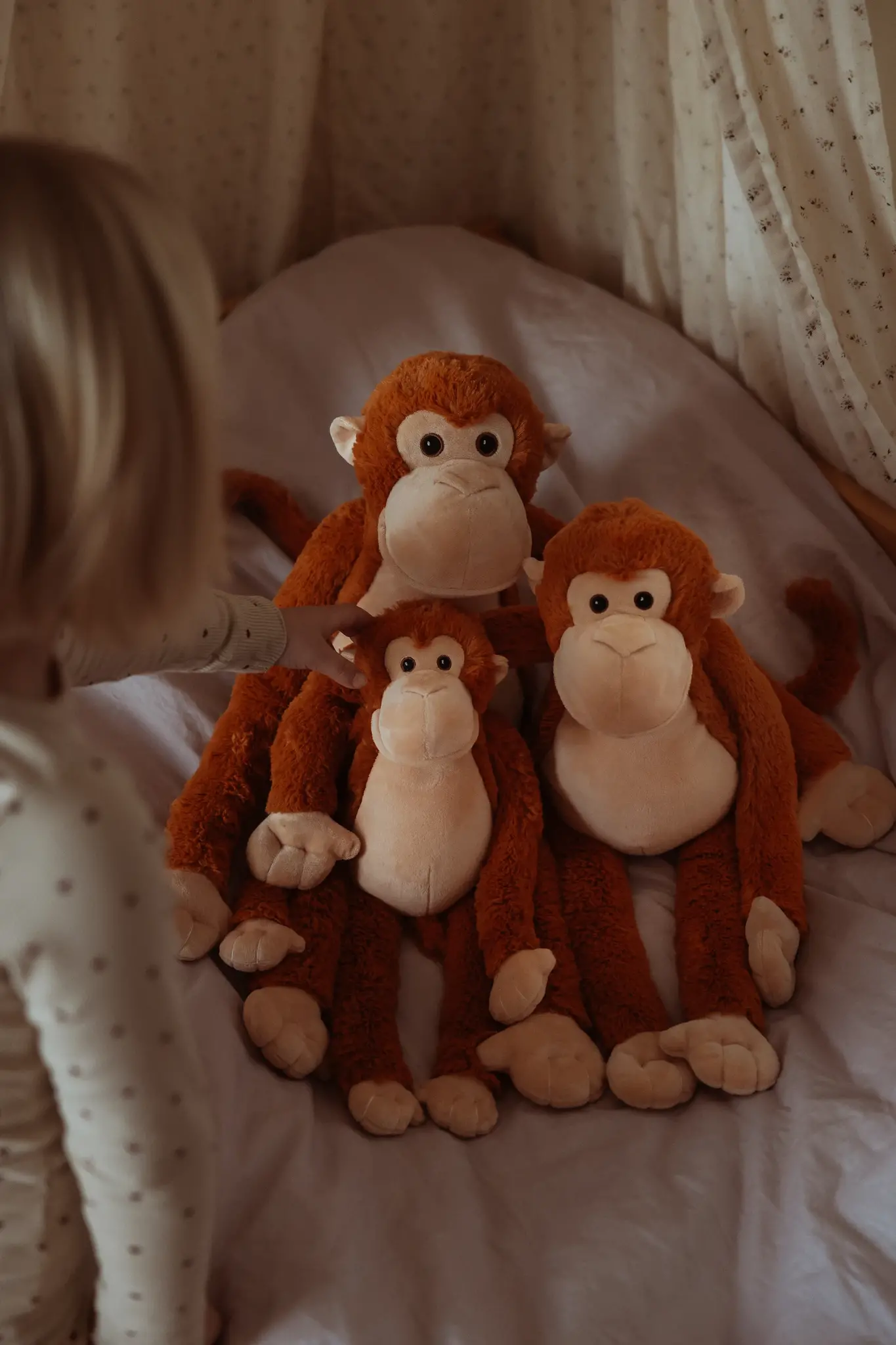 Met zijn warme rode en zandkleurige tinten, de zachtste vacht die je je maar kunt voorstellen en een lieve, zorgzame uitdrukking in zijn ogen, staat deze kleine aap klaar om troost te bieden waar dat nodig is. Het lichtgewicht ontwerp zorgt ervoor dat kleine kinderen hem gemakkelijk kunnen dragen, knuffelen of tegenaan kunnen kruipen tijdens een dutje, voor het slapengaan of onderweg.