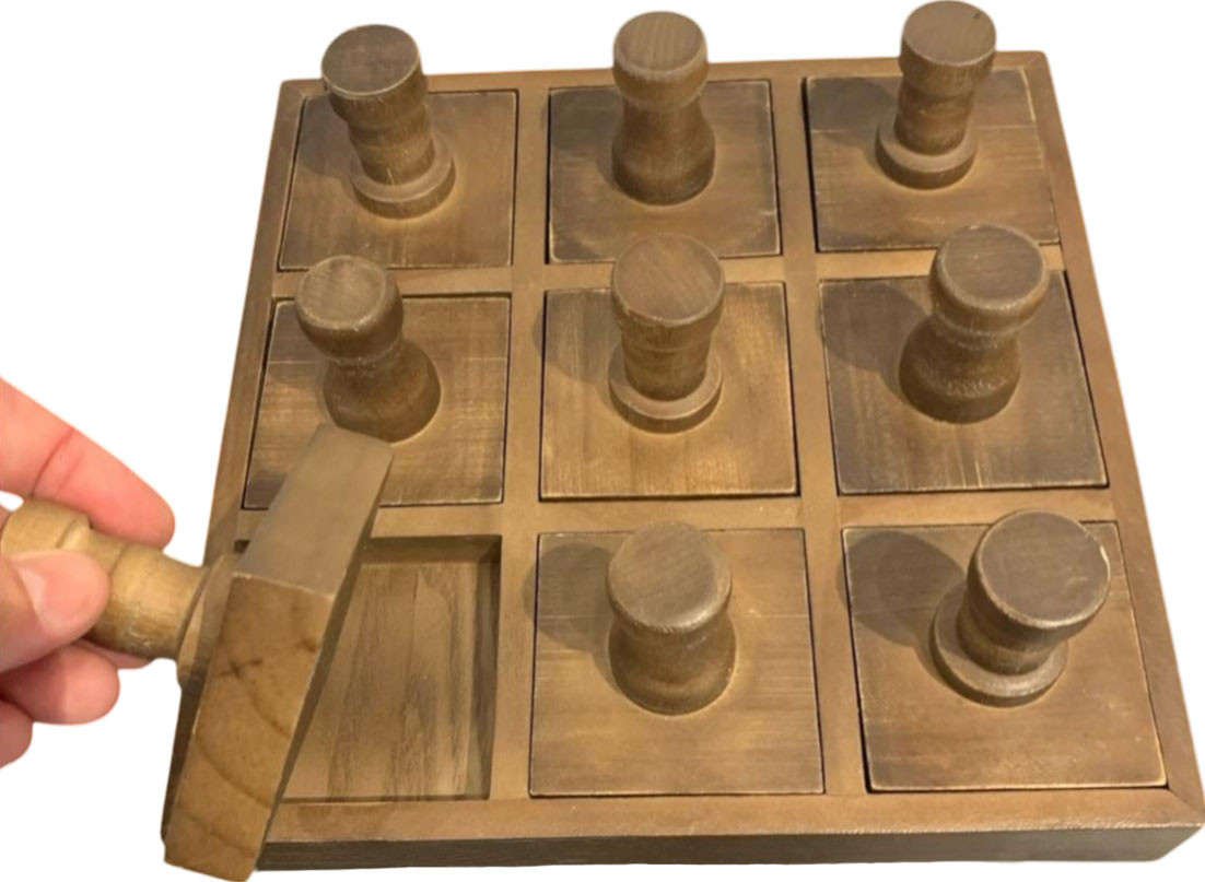 Een 5 cm dikke houten voet met 9 vierkante stempels, genummerd van 0 tot en met 9.